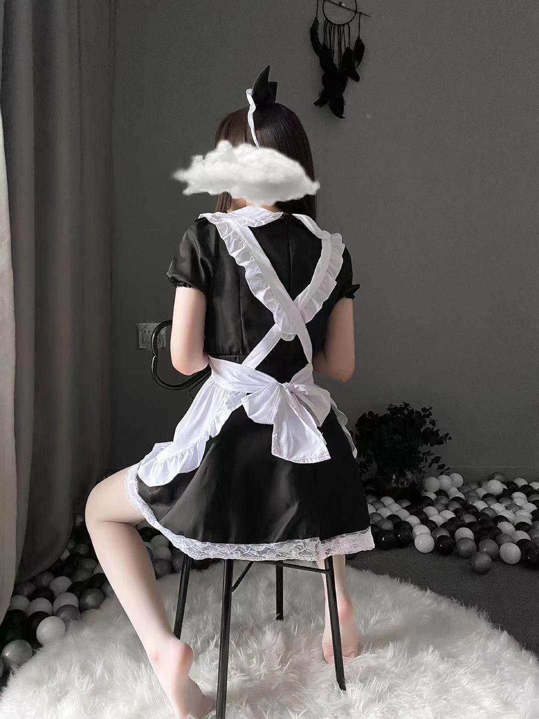 白エプロンと帽子付きの本格的なメイド服で、コスプレイベントや撮影会に最適。