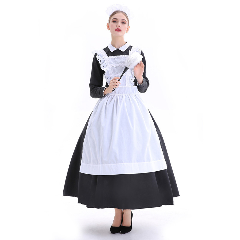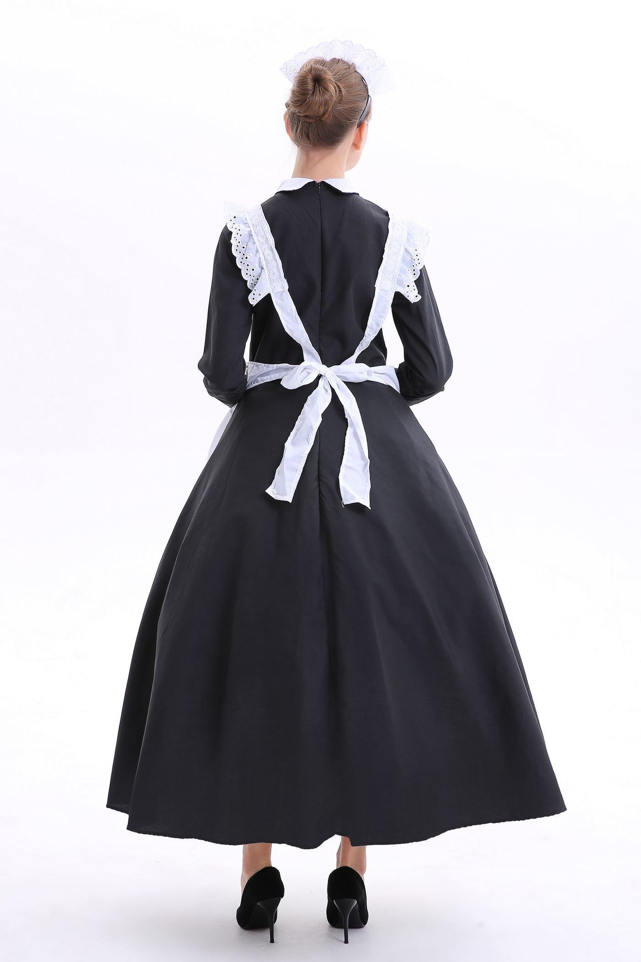 丸襟の長袖ワンピースに、刺繍レースをあしらった豪華なエプロンを重ねた本格的なデザインが特徴です。