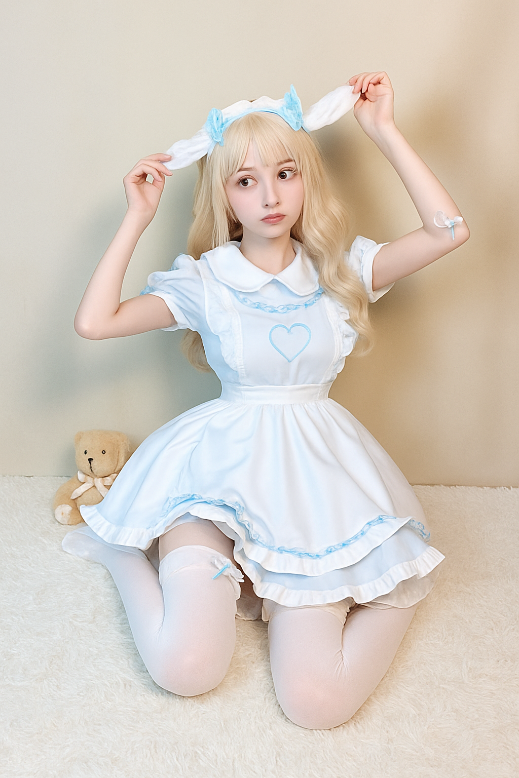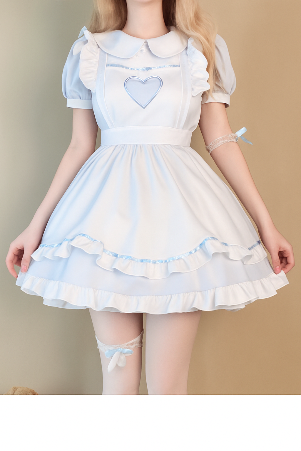 胸元のハート刺繍と丸襟が愛らしさを演出し、パフスリーブと多段フリルのスカートが華やかな印象を与えます。